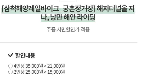 레일바이크 비용이 주중요금 기준으로 4인에 35000원 2인에 25000원. 이 요금에서 할인된 가격 21000원 , 15000원에 이용할 수 있습니다.