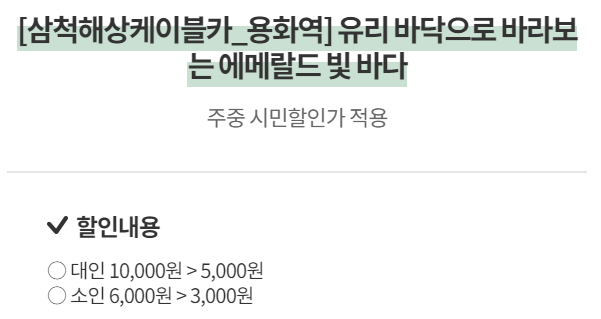 삼척 해상 케이블카를 50% 할인된 가격에 이용하실 수 있습니다.