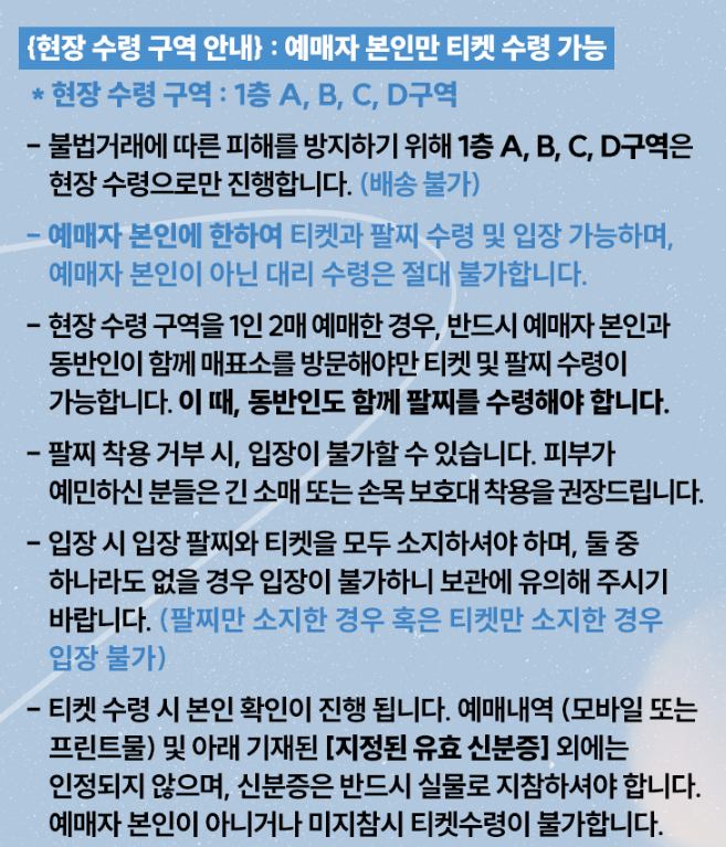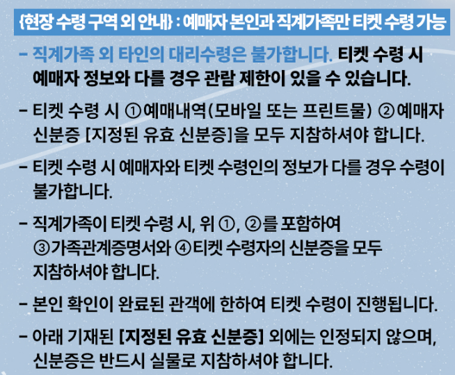 티켓 수령시 본인확인 가능한 신분증이 필요합니다.