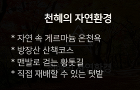 온천욕, 산책코스, 황톳길등 체험시설이 많습니다.