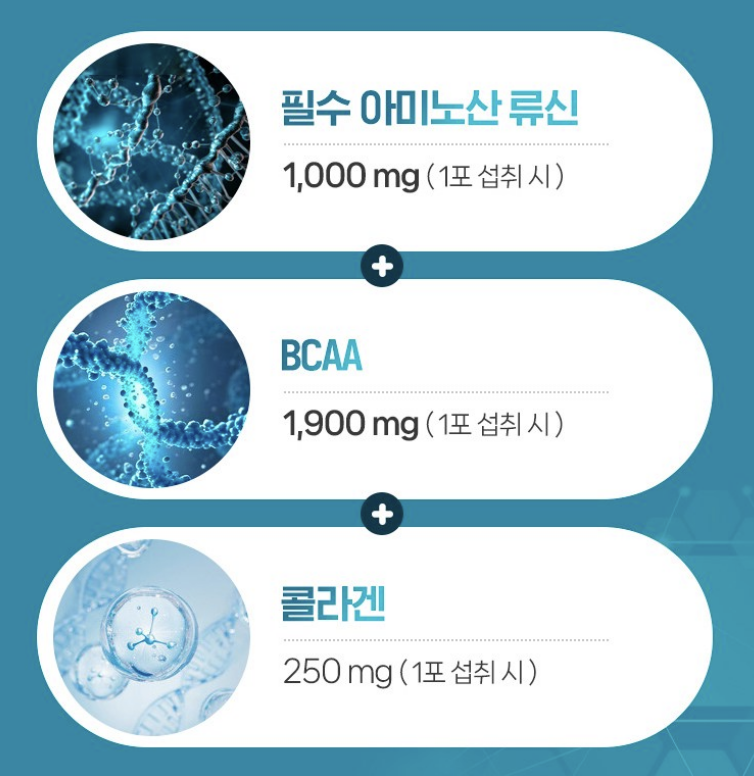 필수아미노산 류신 1,000mg 과 콜라겐 250mg이 포함되어 있습니다.