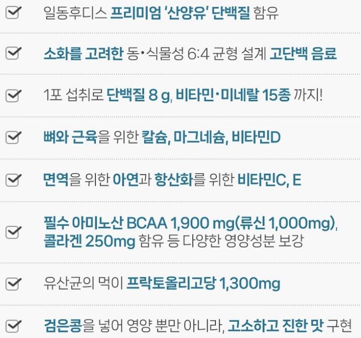 하루에 1포 섭취로 단백질 8g과 비타민 미네랄 까지 챙길 수 있습니다.
