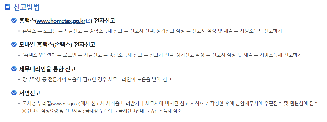 서면신고 의 경우 국세청 누리집에서 신고서식을 내려받거나 세무서에 비치된 서류를 작성하여 우편접수 및 민원실에 직접 접수하여 신고 할 수 있습니다.