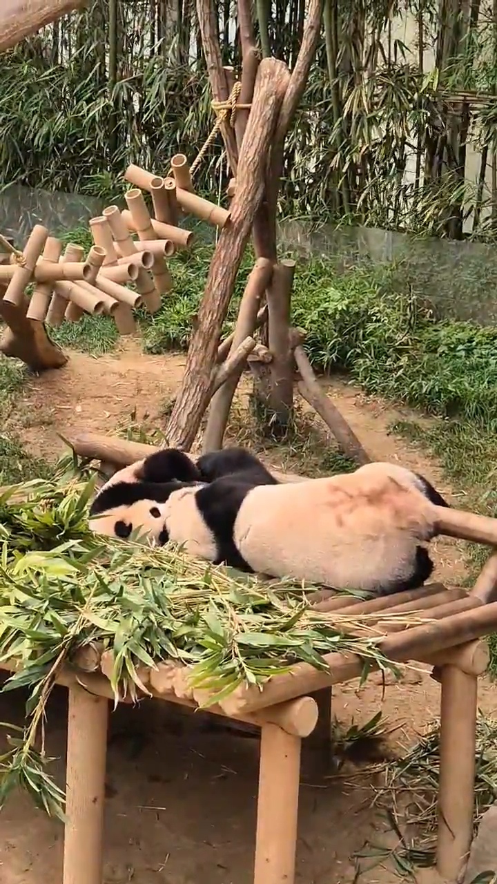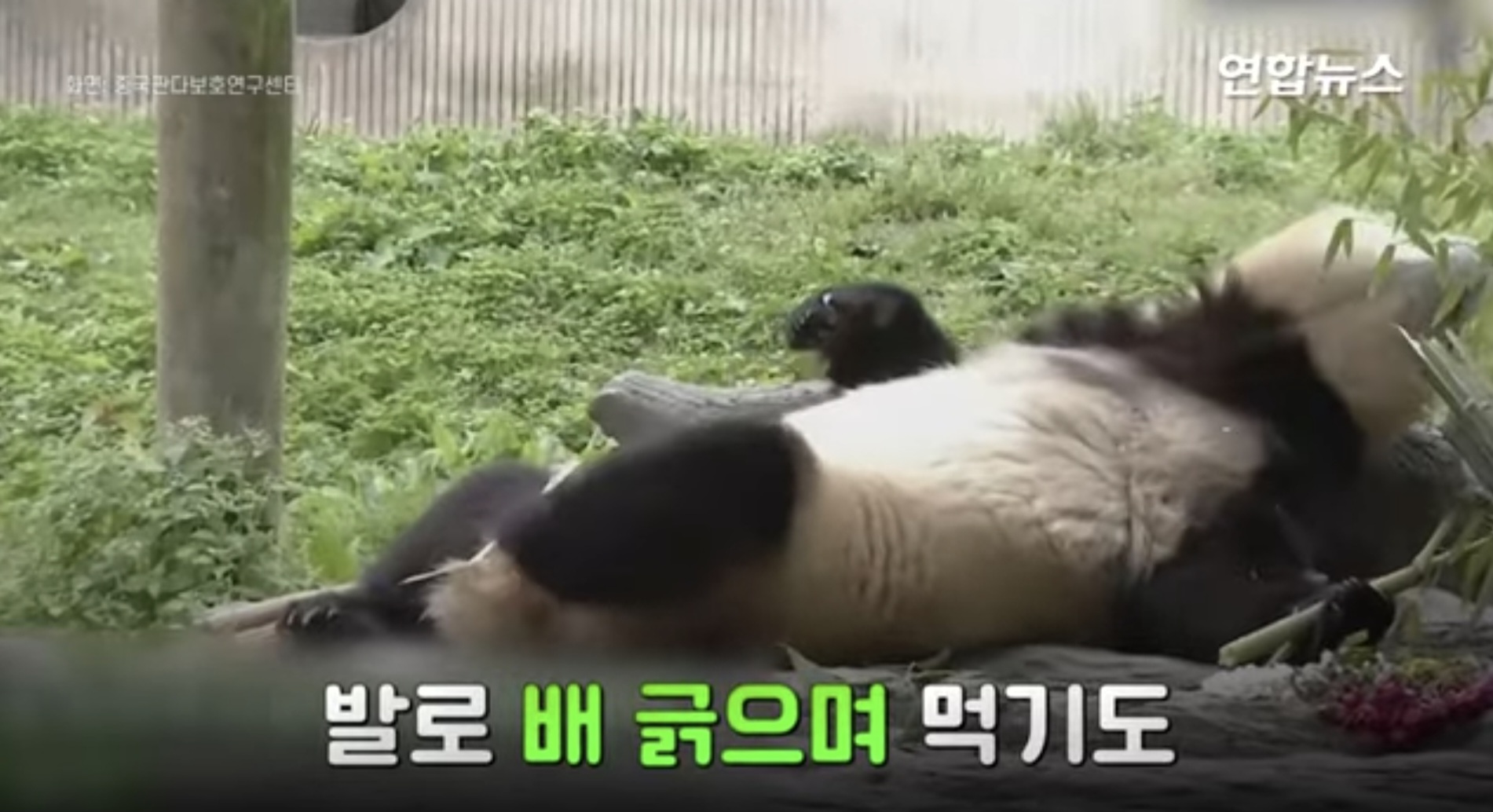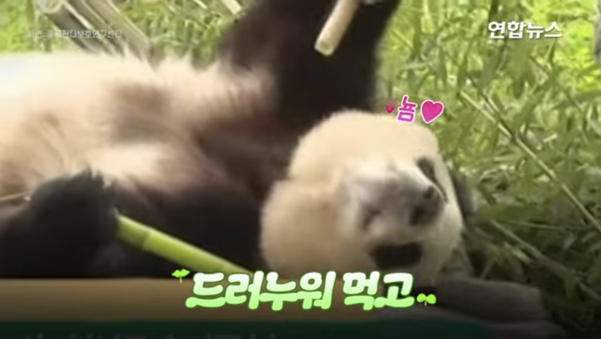 푸바오는 드러누워서 죽순을 먹기도 하고