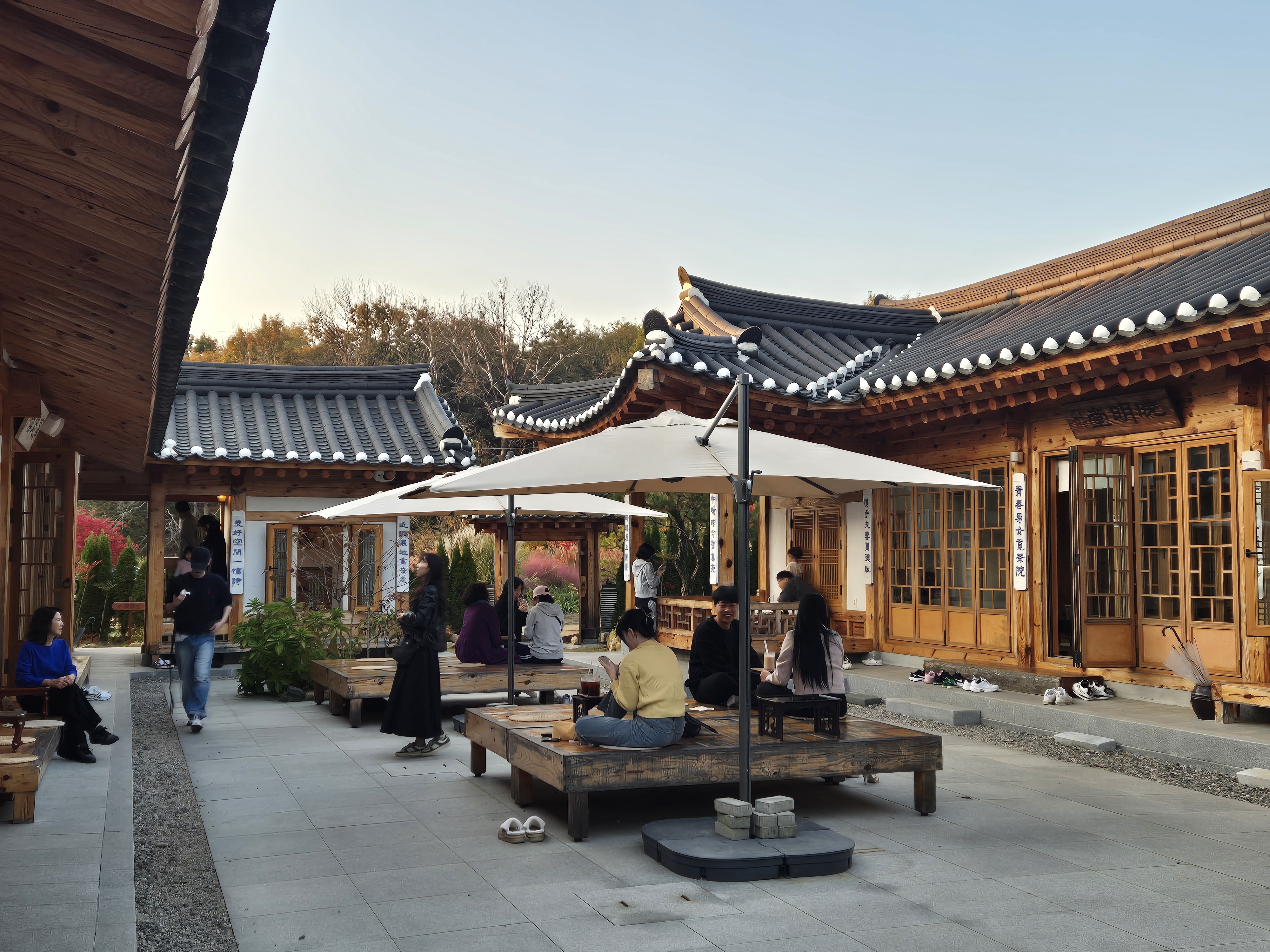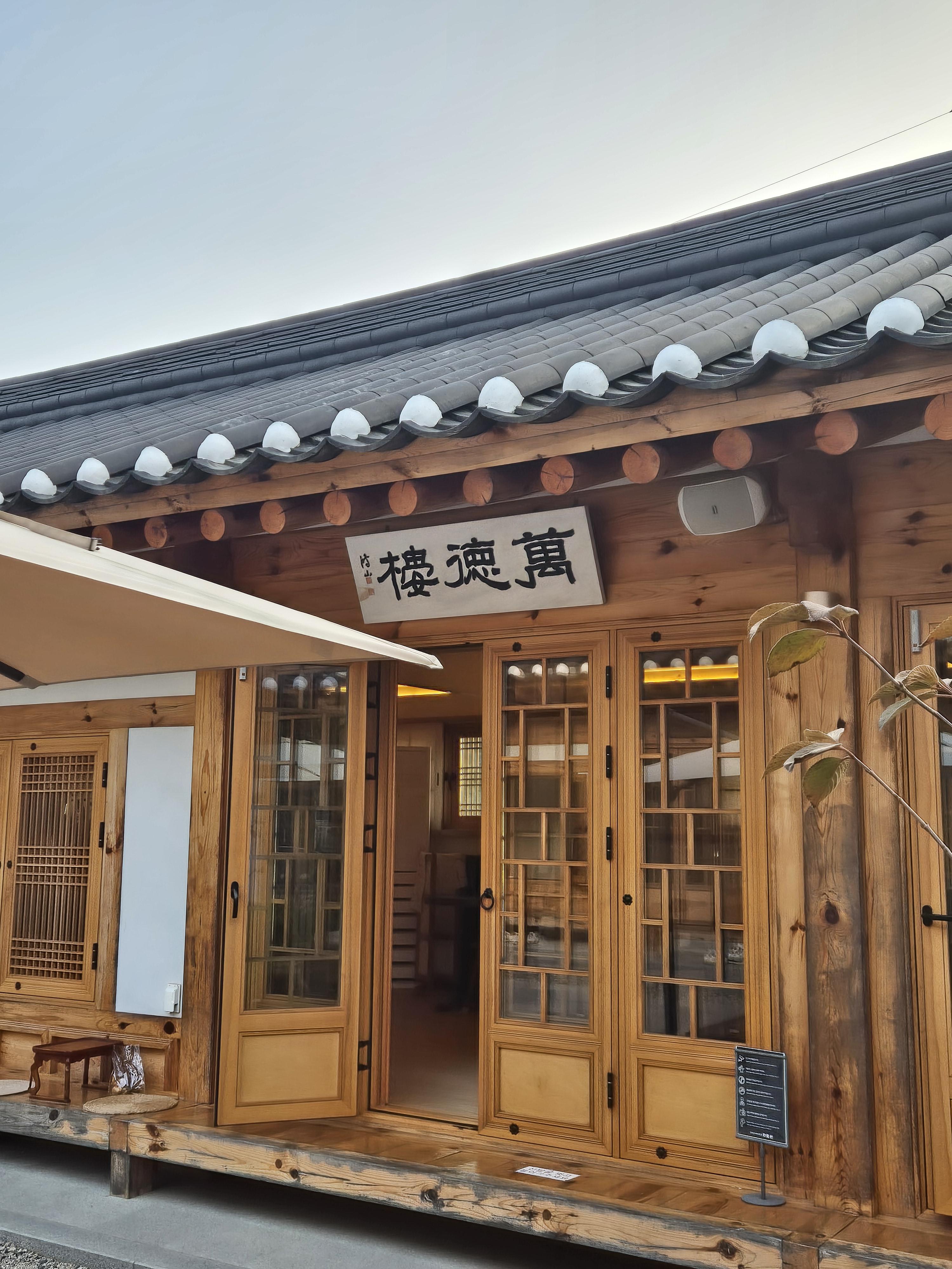 만덕루와 효명당 두채의 한옥 공간이 있고 그 사이 마당에는 평상이 놓여있는 야외 자리가 있습니다.