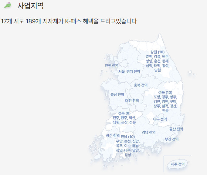 17개 시도 189개 지자체에 거주하는 주민은 케이패스 혜택을 받을 수 있습니다.